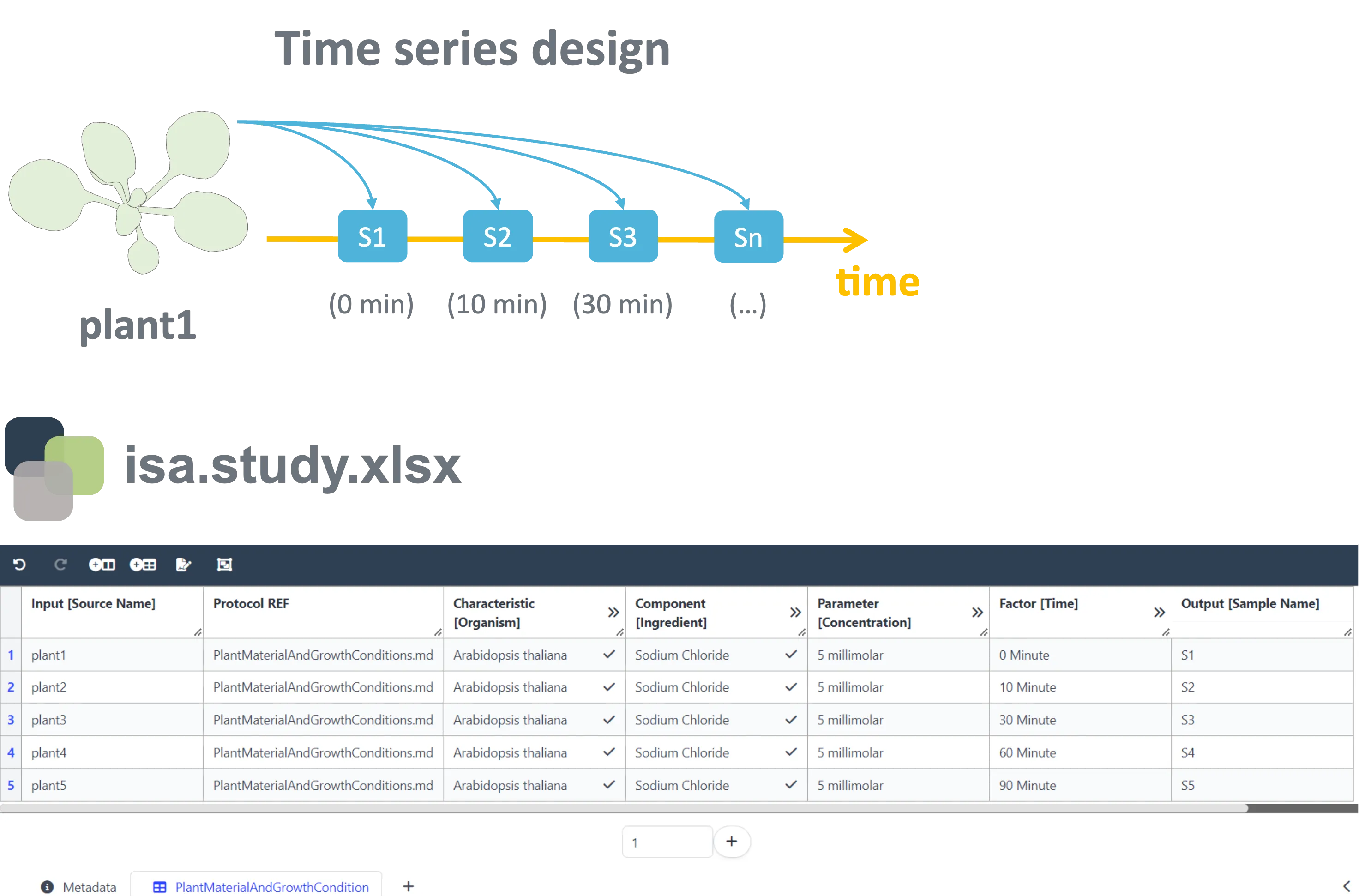 In this example we take a look at the annotation of a time course. Let’s imagine a study in which our plant of interest (plant1), Arabidopsis thaliana (Characteristic [Organism]), was exposed to salt stress (Component [Ingredient]). To investigate the cellular response, you harvested samples at various time points after exposure to the stressor: S1 is harvested right away, S2 after 10 minutes, and so on.
