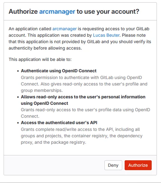 If you are using the ARCmanager for the first time, you will see a window (Fig. 4) asking you to authorize the ARCmanager application to authenticate you and edit files of your projects on your behalf. Use the Authorize button to proceed.