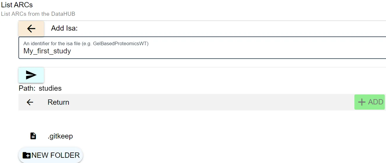 Navigate to the studies folder of your ARC. Then, click on the green ADD button to create a new study. A new input field will appear in which you need to specify a name for the study. Avoid whitespace characters when choosing a name for the study.