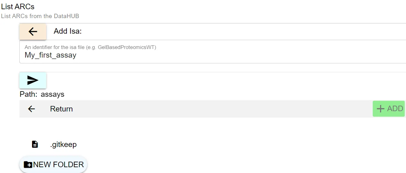 Next, navigate to the assays folder of your ARC. Assays are added in the same way as studies, by using the ADD button and choosing an identifier.