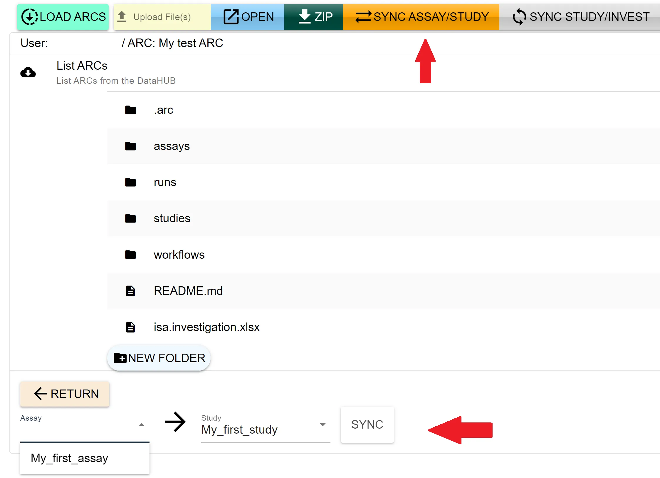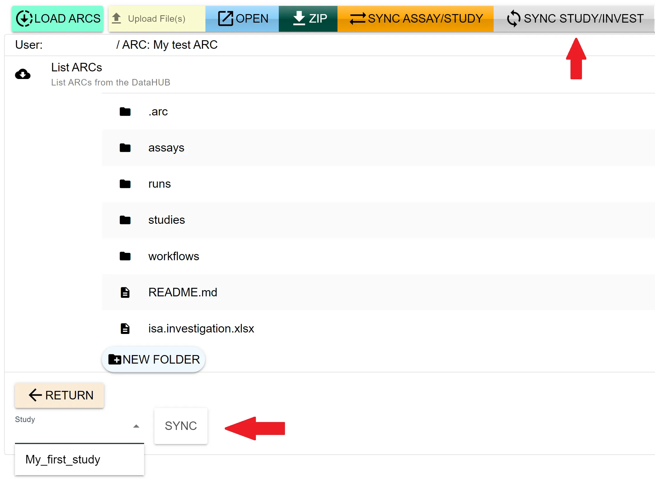 Navigate to the top-level directory of your ARC, then click on SYNC STUDY/INVEST. A new input field will appear below the list of files insider your ARC. Select the study you want to register from the drop-down menu and click the SYNC button.