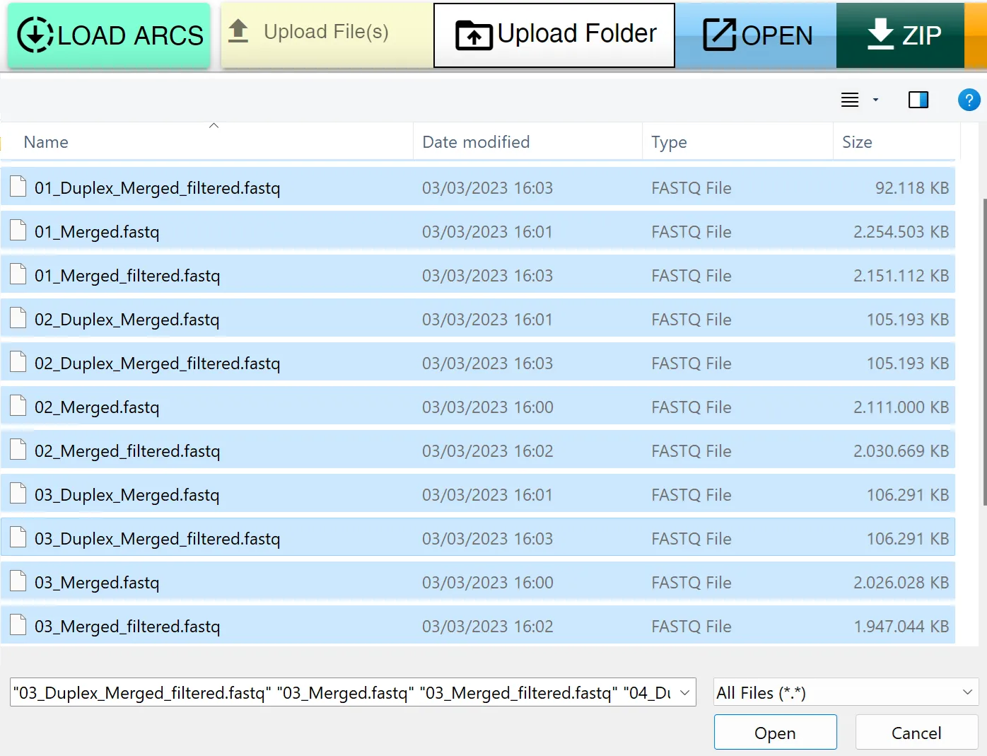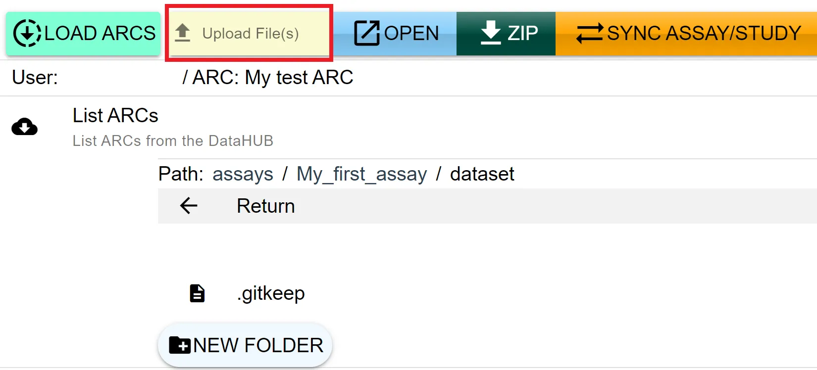 You can upload raw data from your local computer directly to the remote copy of your ARC on any DataHUB by using the ARCmanager. Assume we need to add some raw data to the dataset directory of an existing assay. To do so, first navigate to the dataset folder and use the UPLOAD File(s) button at the top of the screen. Then, select the files you want to upload from your local file system, and click Open to begin with the upload.