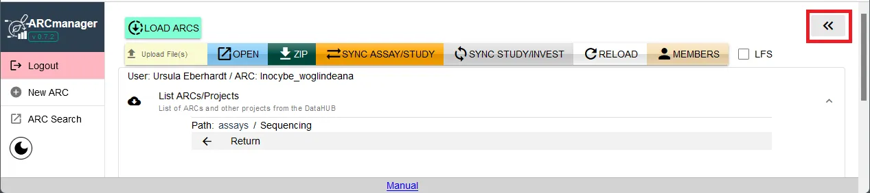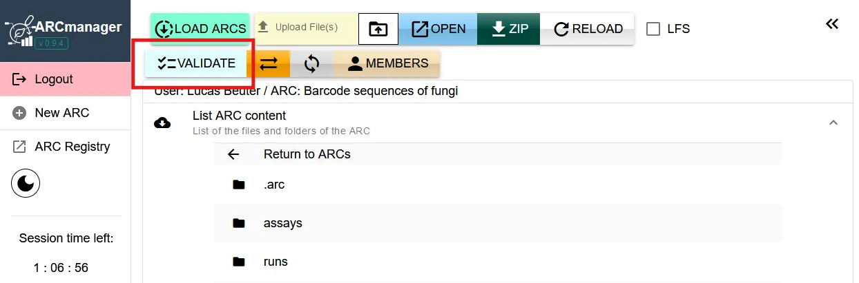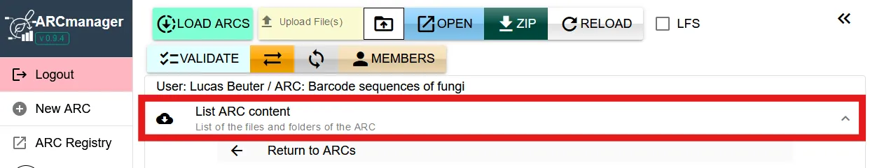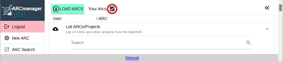 With the LOAD ARC button (Fig. 1), all ARCs on the DataHUB will be listed for which you have at least viewing rights. This includes ARCs that are set to public, ARCs to which you were added as a member, and ARCs owned by you. Your own ARCs are additionally highlighted in color.