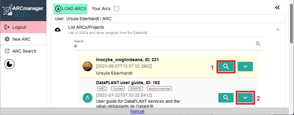 Fig. 3 List of ARCs and buttons to interact with them. (1) Open DataHUB page of the ARC in a new browser window, (2) View ARC contents inside ARCmanager.