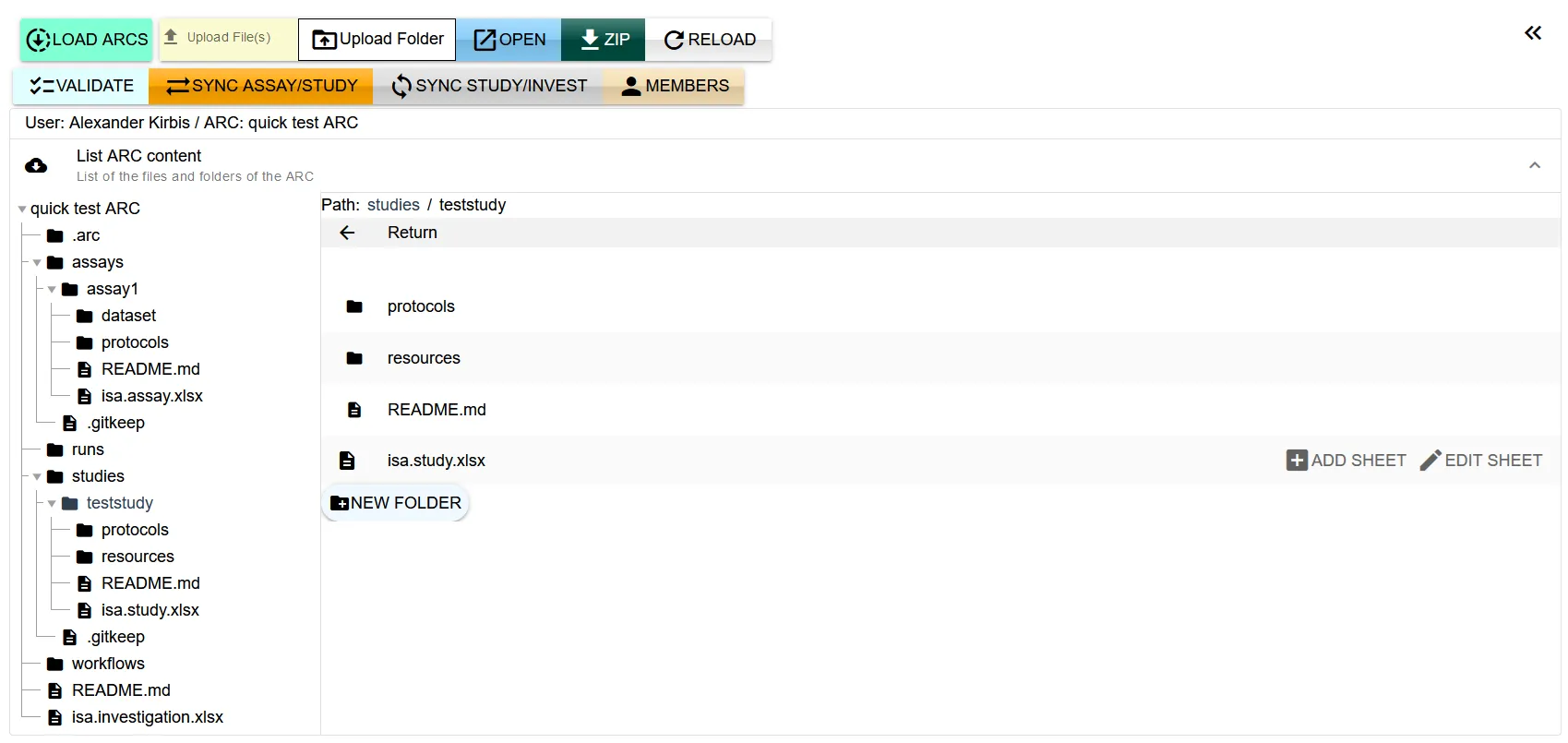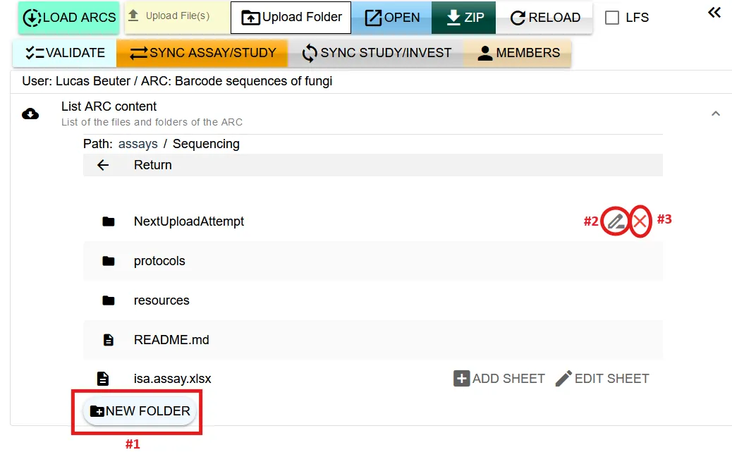 These custom folders can be renamed (Fig. 11, #2) or deleted (Fig. 11, #3). This is in contrast to the directories which are part of the ARC specification (e.g. studies, assays, etc.), which can not be renamed or deleted via the ARCmanager.