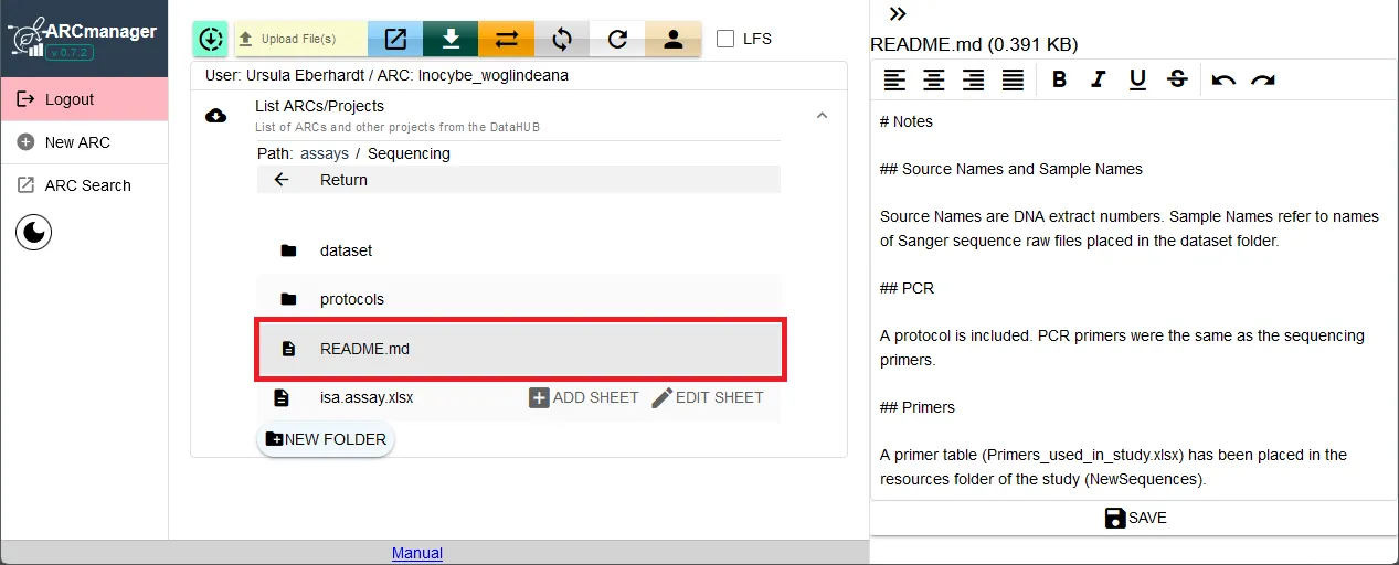 Plain text files (.md, .txt or similar) can be modified directly in this editor. Do not forget to save your changes and synchronize with the DataHUB by using the SAVE button when you are done.