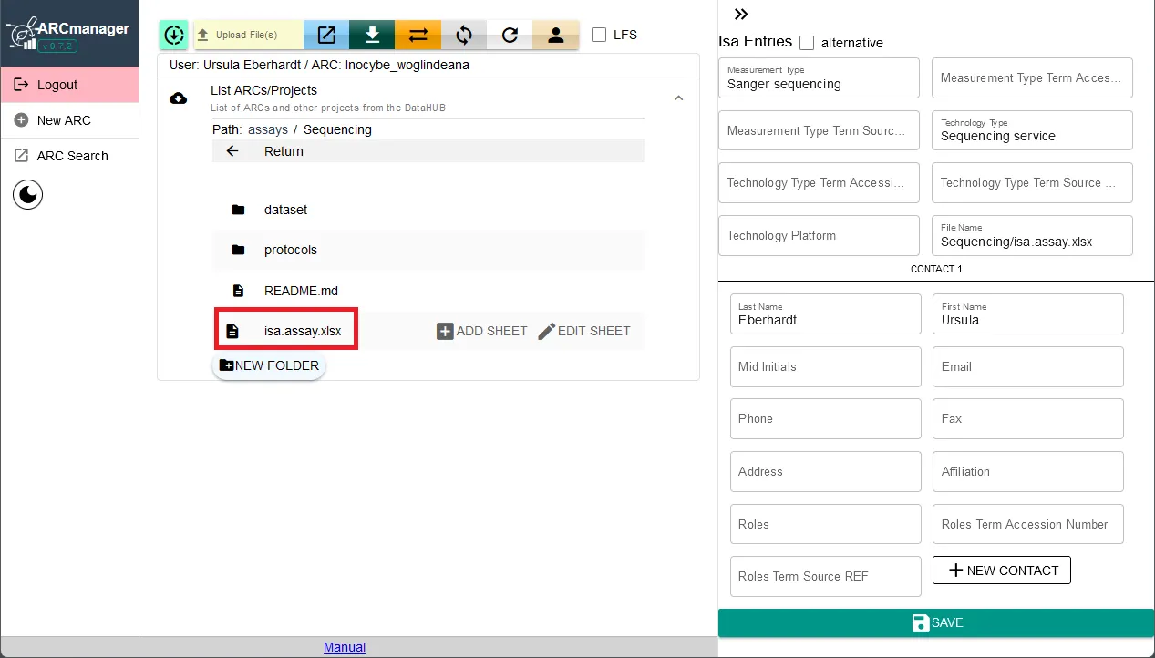 When selecting an ISA file, the editor panel will open as well, but instead of a text editor you will see a form that allows you to add metadata entries to the ISA file (Fig. 8). To learn more about adding metadata using the ARCmanager, visit the corresponding manual page.