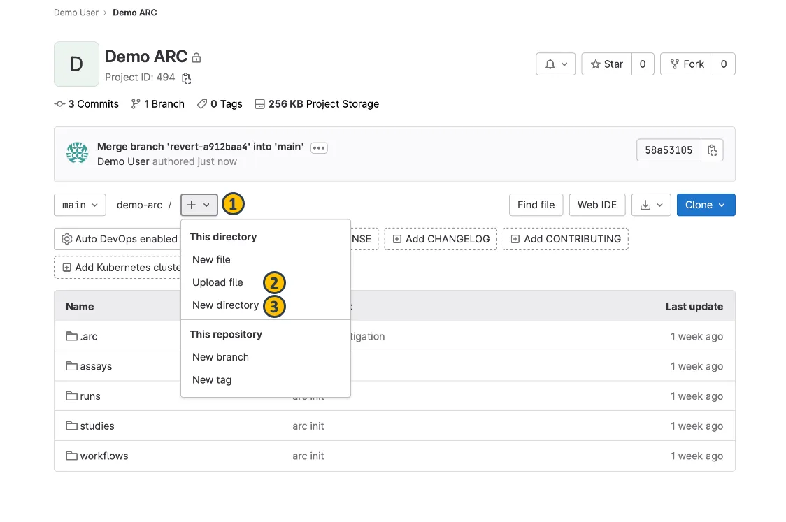 - Select to upload a file (2) or create a new directory (3) in the current directory.
