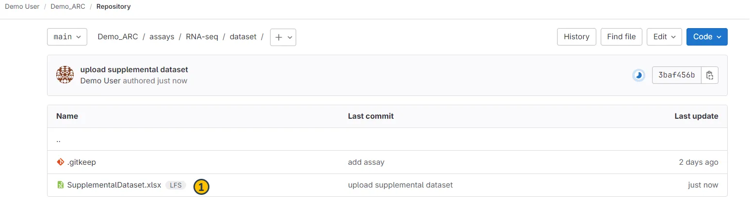 Open your ARC in the DataHUB and navigate to the folder with LFS objects. Files uploaded with LFS are flagged as “LFS” (1).