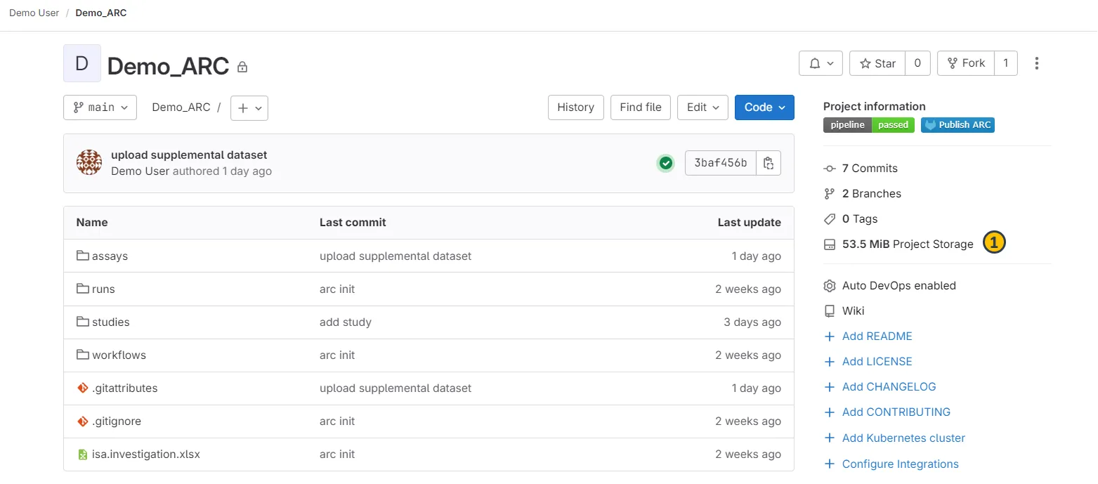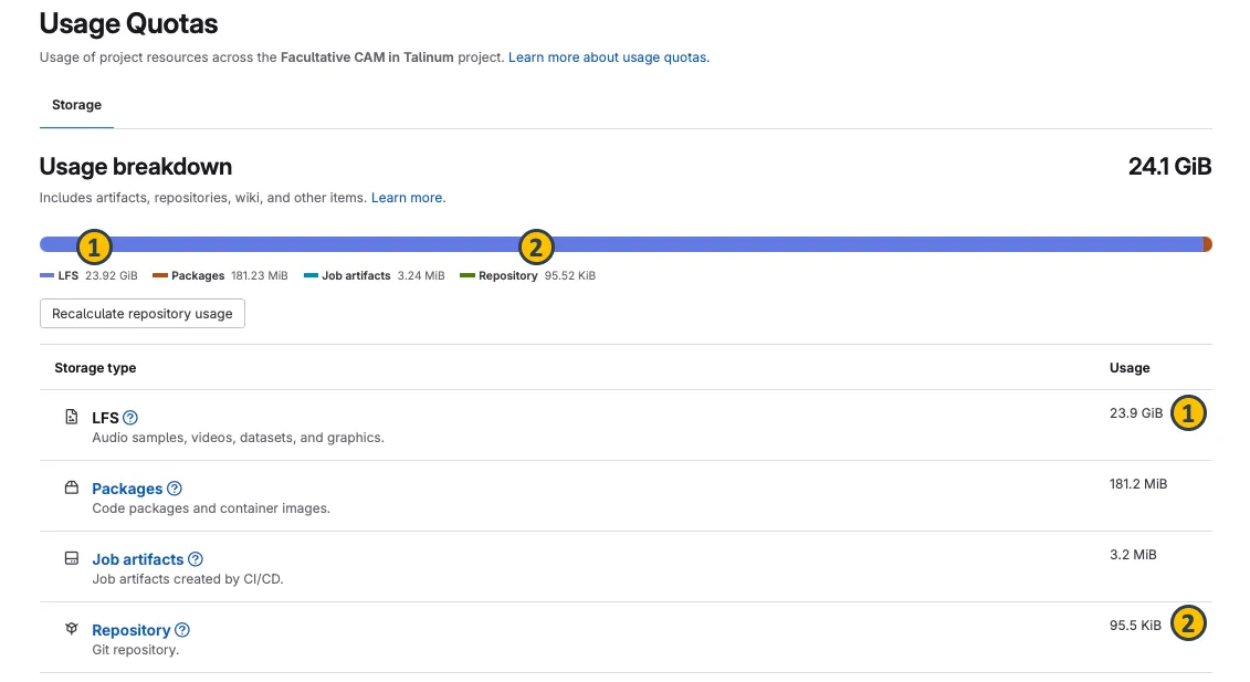 In terms of usage quota, two numbers are particularly important: LFS (1) and Repository (2) The majority of quota should fall into “LFS”, while the size of “Repository” should be kept small. If too many files are in “Repository”, this slows down the communication with and processing of your ARC.