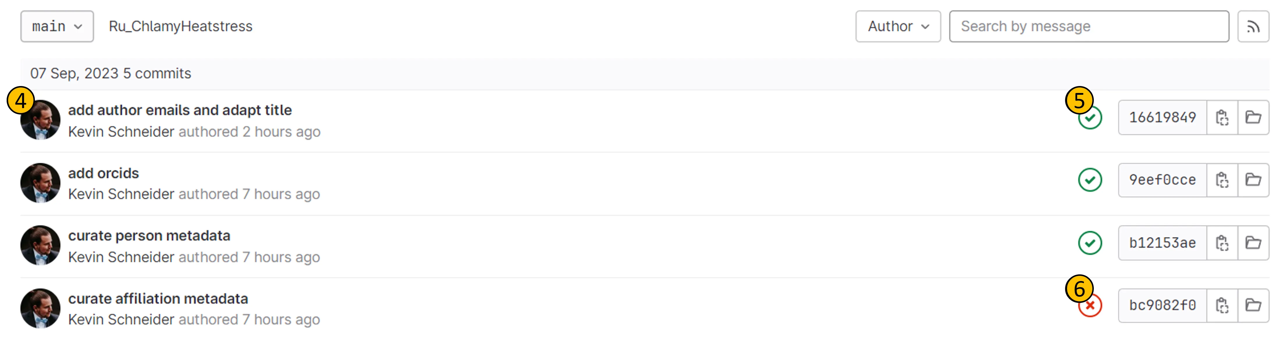 - (6): Pipeline result: If the pipeline failed, it shows a red cross.