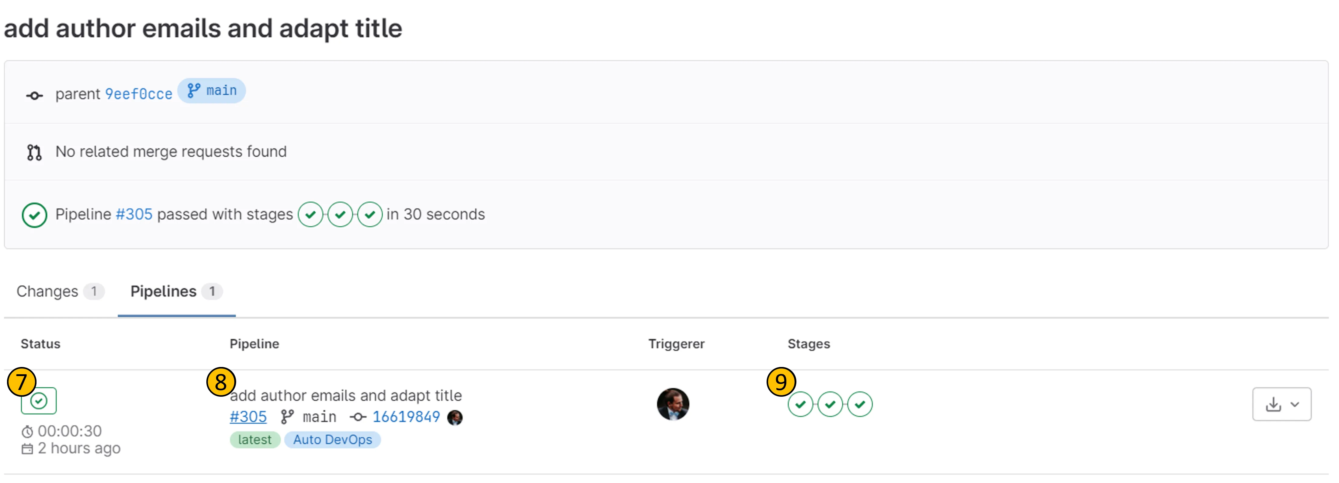 - (5): Pipeline result: If the pipeline passed, it shows a green checkmark.