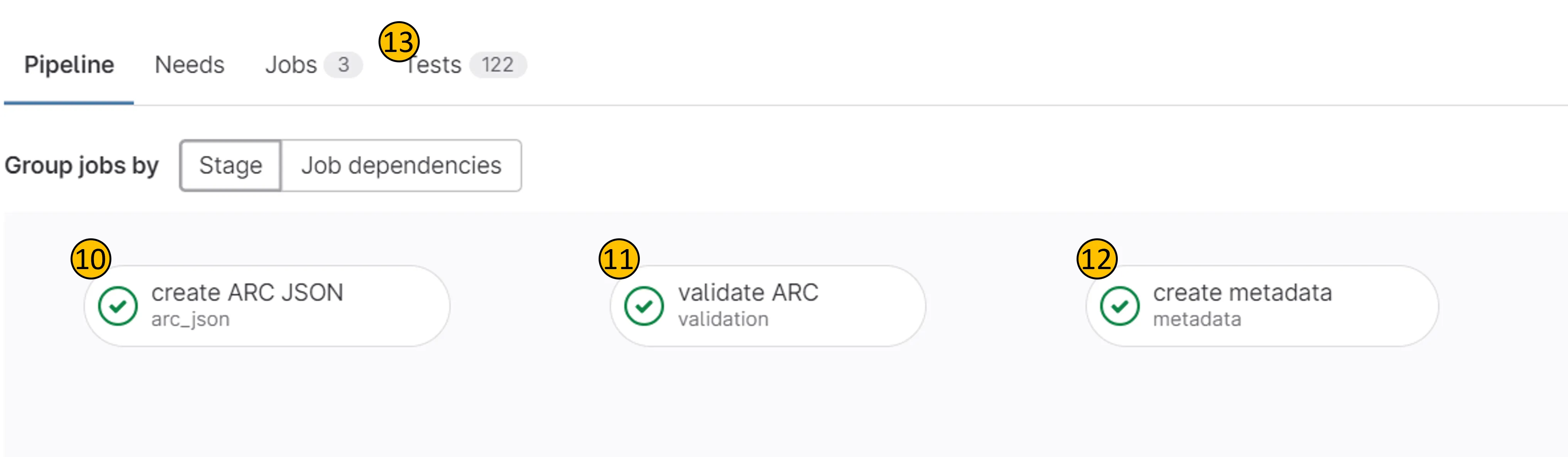 Section titled “CQC step 2 fails”CQC step 2 (11), is the most common step to fail. This step contains a set of critical quality checks that MUST pass in order for the ARC to be eligible for publication, and a set of non-critical checks that signify metadata quality. Only failed critical tests lead to a failed CQC pipeline. If this happens, investigate the failed tests in the Test tab (13), and fix the issues based on the information displayed there. An example could for example be a person not having a First name in your investigation metadata. Commit your changes and check wether the tests pass.