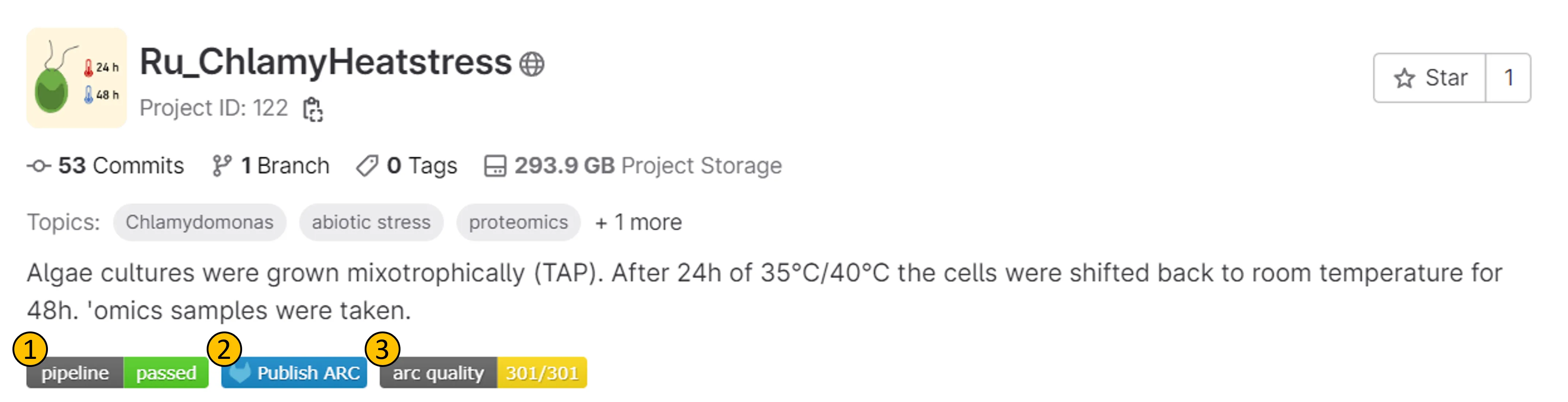 - (3): The arc quality badge indicates the overall metadata quality of the ARC. This is calculated based on the results of the CQC pipeline, and signifies how many of the performed tests have passed. The badge is color-coded, and the color indicates the quality of the ARC.