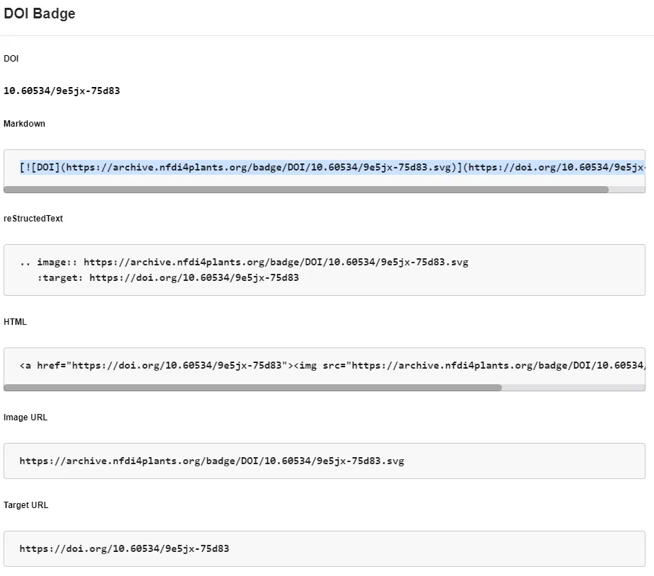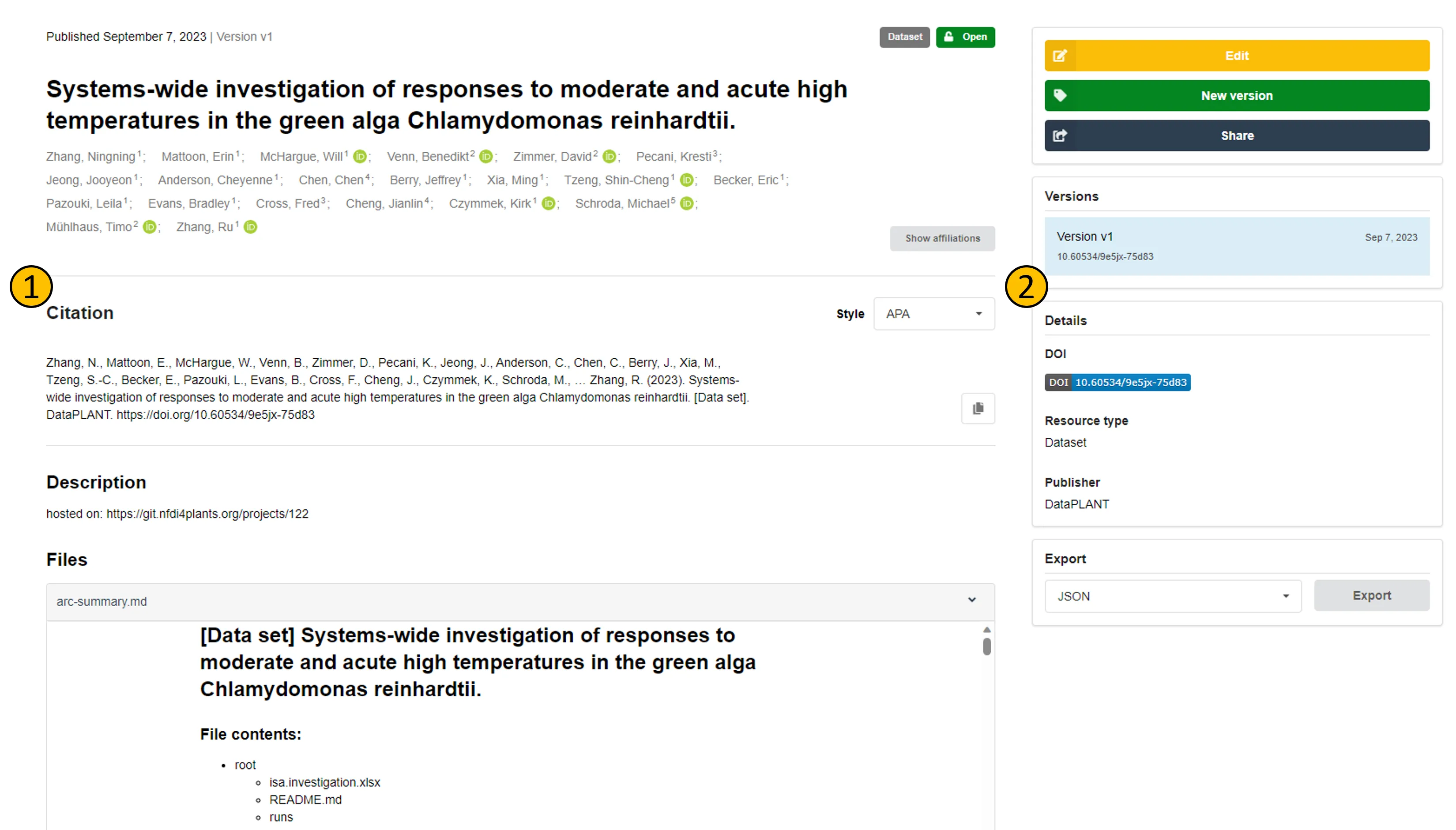 Section titled “How to display your DOI as a badge on your ARC (or other websites)”By clicking on the DOI badge (2), you can get the code to display the badge on your ARC homepage or other websites.