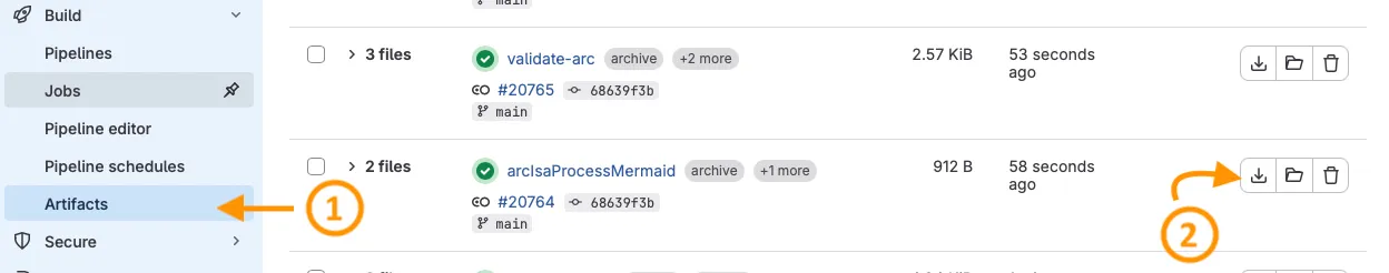 arcIsaProcessMermaid) in the list of artifacts and click the download icon (2)