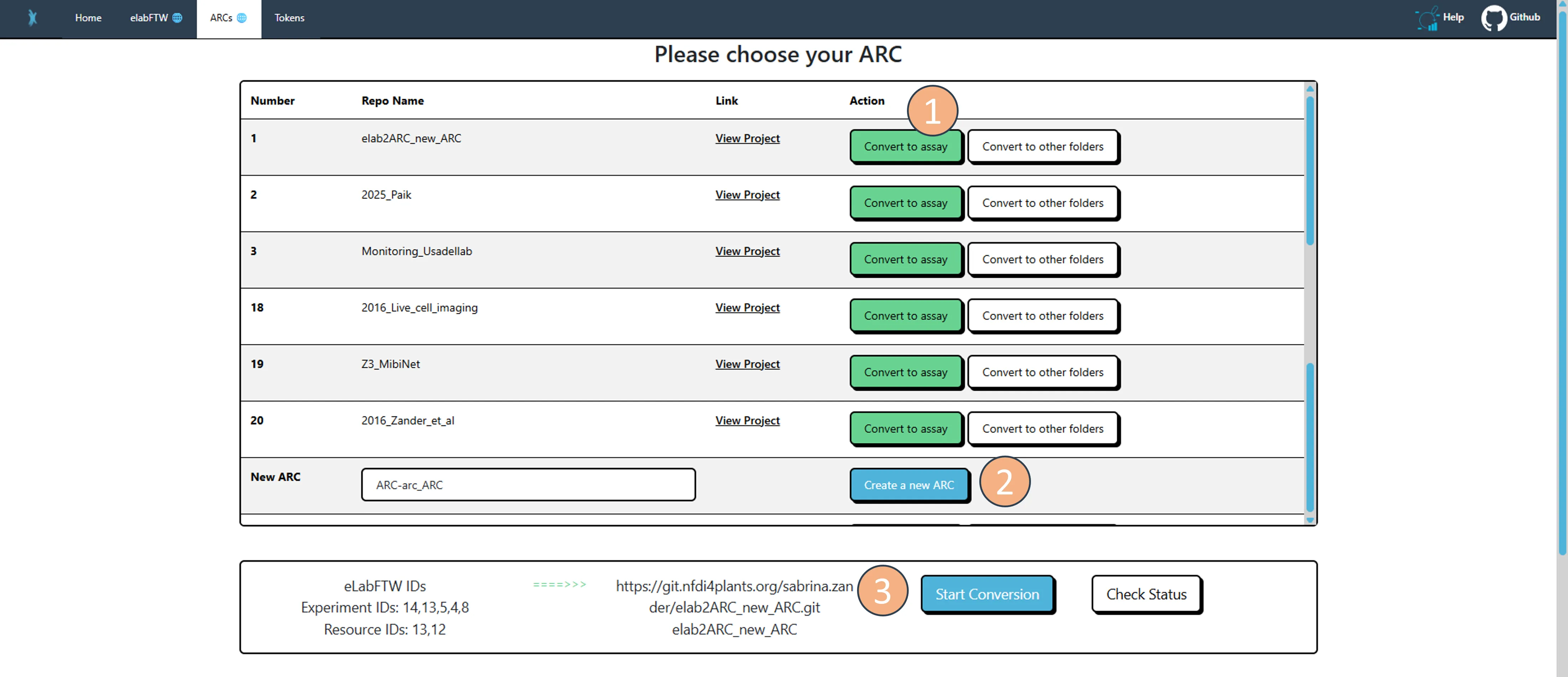 ARCs tab, select the ARC into which the elabFTW entry should be converted. - You can use an existing ARC by clicking the Convert to assay button [1] or create a new ARC with the Create a new ARC button [2].