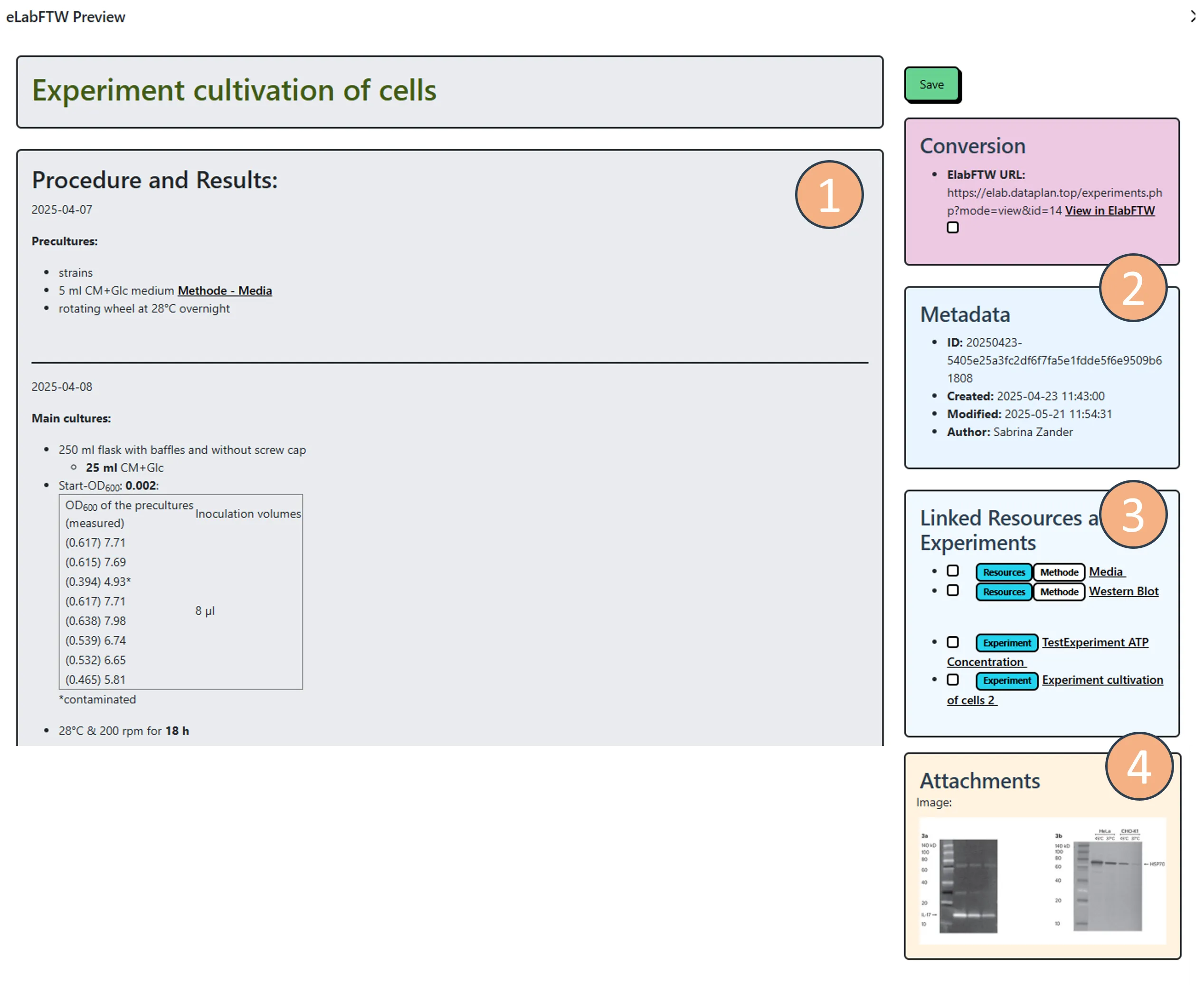 eLabFTW taband shows more information about the eLabFTW entry. Here you can also select linked Experiments/Resources for conversion.