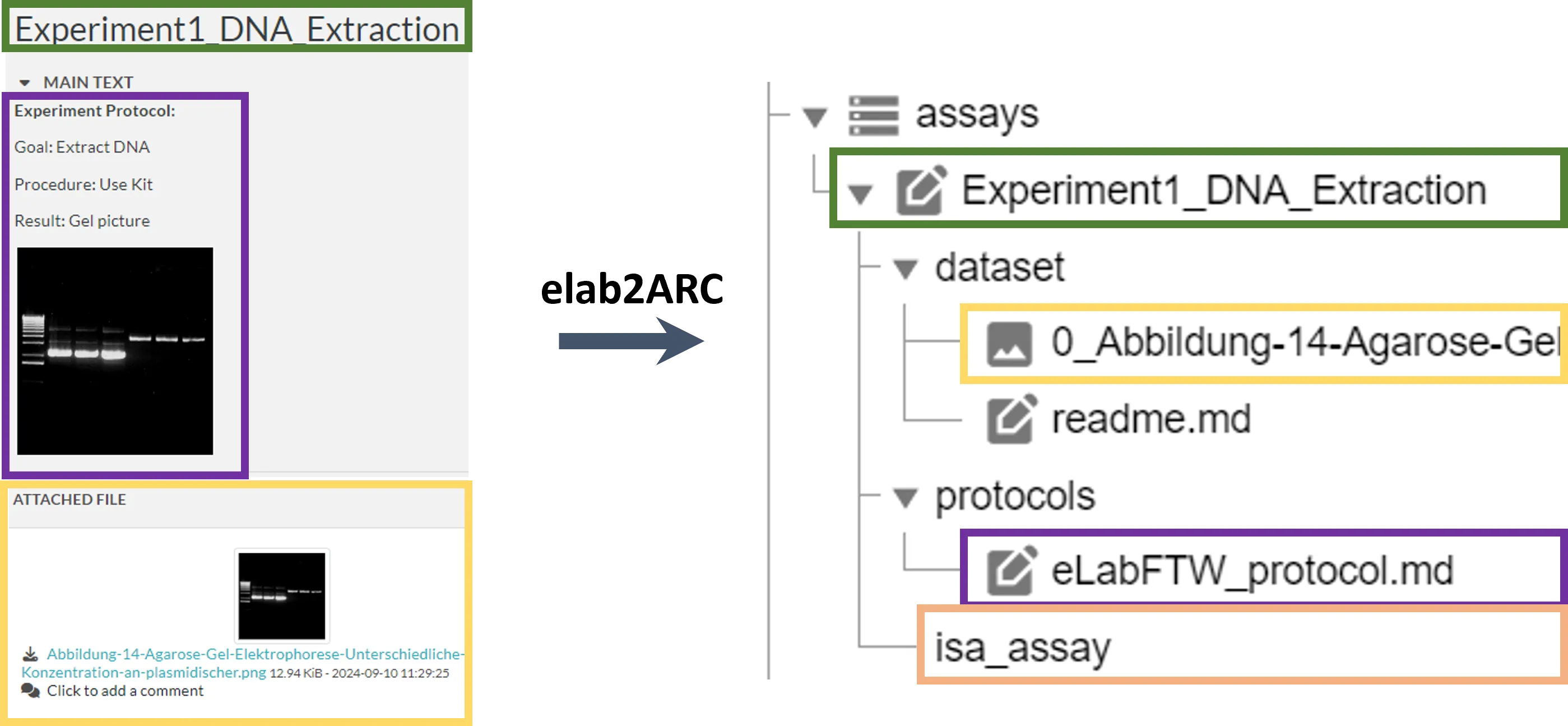 Manually transferring metadata from ELNs to ARC can be both error-prone and time-consuming. To address this challenge, elab2ARC provides an efficient solution by automating the extraction, transformation, and loading (ETL) of data from ELN records into ARC-compliant structures. This tool streamlines the process, reduces errors, and ensures consistency, enhancing research data management workflows.