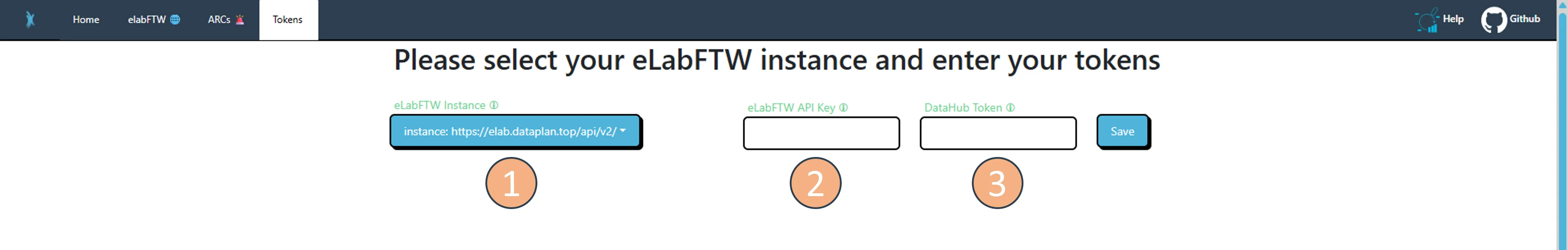 Tokens tab, select your eLabFTW Instance or add Instance [1] - Paste eLabFTW API key [2]