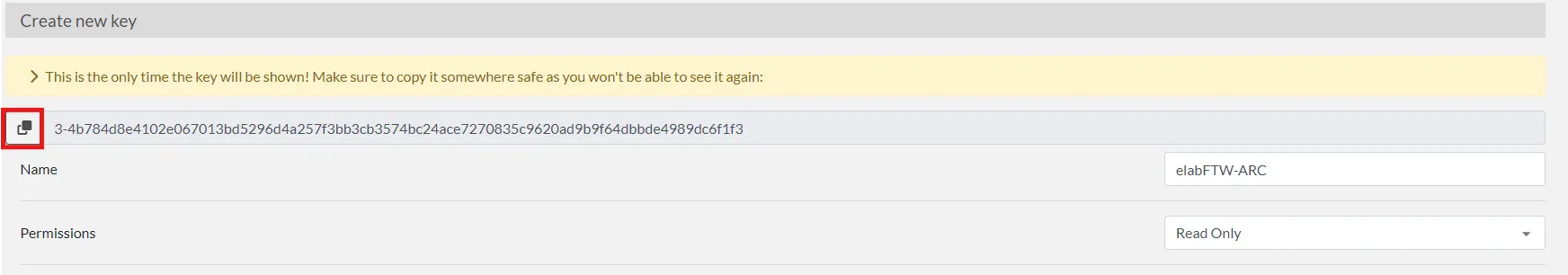 - Save the key securely, as it will only be displayed once. Treat it like a password, as it grants access to eLabFTW.
