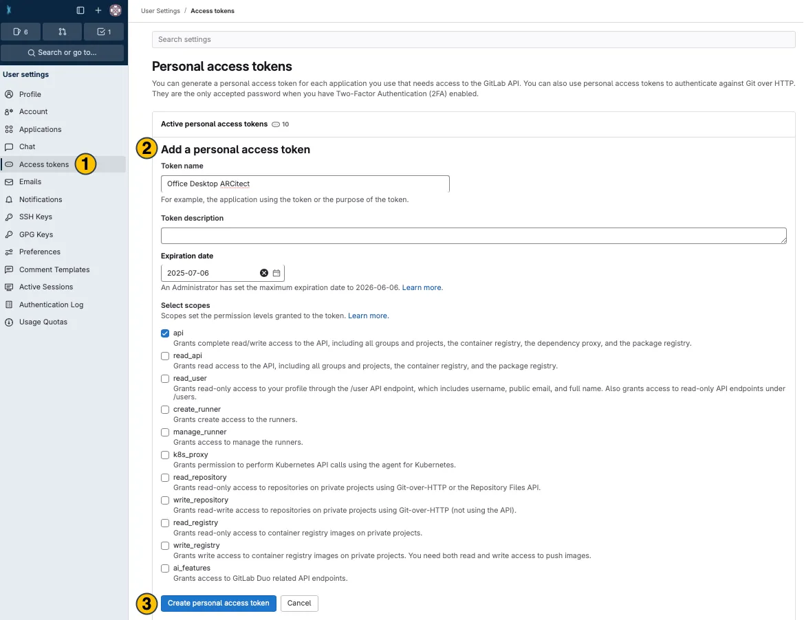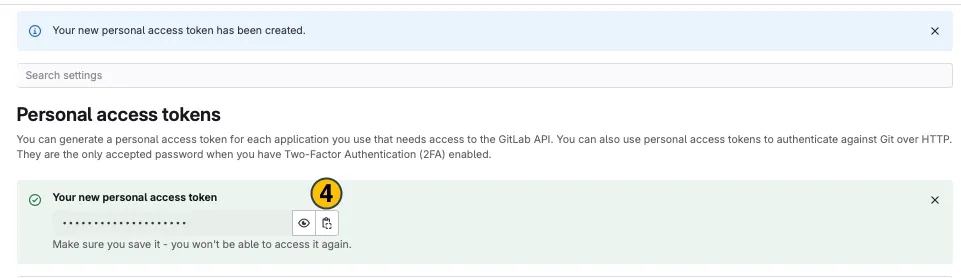 Your new personal access tokenappears on top. Copy(4)and use it in the desired application.