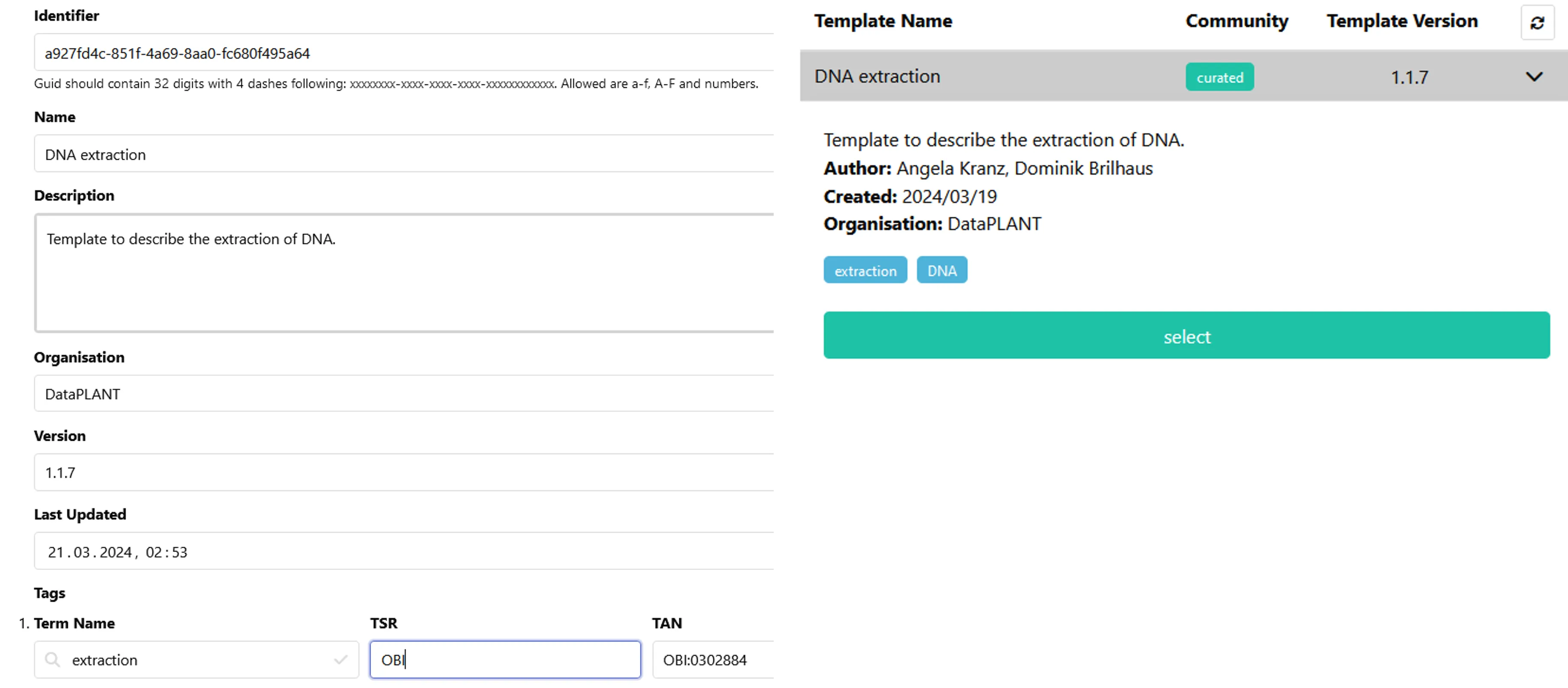 | Tags | You can add any number of tags here. These tags are the basis to search for your template. | If possible add them as ontology terms with source ontology (TSR) and unique identifier (TAN). If similar tags already exist, consider reusing the existing ones. |